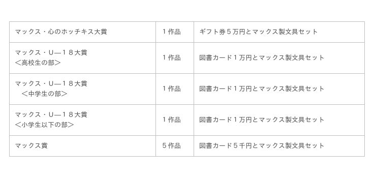 厳正な選考により、特に優れた作品1点を『マックス・心のホッチキス大賞』とするほか、『マックス・U-18大賞』として高校生の部・中学生の部・小学生以下の部から各1点、『マックス賞』として優秀作品を5点選び、表彰します。受賞作品には、マックス「心のホッチキス・ストーリー」の題字・イラストを手掛けている北村人氏による描き下ろしイラストを制作し、結果発表時に作品とともに当社WEBサイトに掲載します。