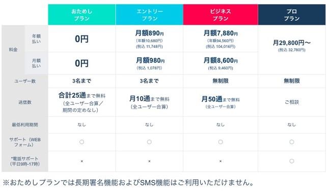 「おためしプラン」は利用期間の制限がなく、ユーザー数3名までで、送信数を全ユーザーで25通までお試しいただけます。