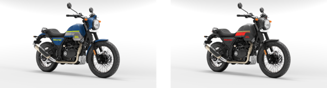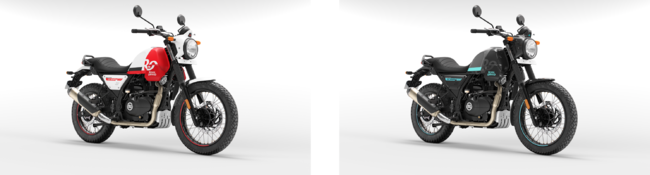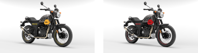 Scram 411は、スケートボードなどのストリートカルチャーや、東京やニューデリーなどで活発なナイトカルチャーからインスピレーションを得たカラーリングをデザイン。3タイプ合計7つのカラーバリエーションをラインナップしました。グラファイトイエロー、グラファイトレッド、グラファイトブルーのカラーネームを採用するScram 411は、側面に411のグラフィックをデザインしたグレーの燃料タンクに、カラーネームと同色のタンクバッジをコーディネイト。車体色に合わせたサイドパネルロゴとホイールリムテープもデザインしました。スカイラインブルー、ブレイジングブラックは、ロイヤルエンフィールド・ブランドを象徴するカラーを燃料タンクにストライプでデザインしました。最上位モデルのホワイトフレーム、シルバースピリットは、それぞれのタンクカラーをユニークで楽しいグラフィックとともにデザインしました。