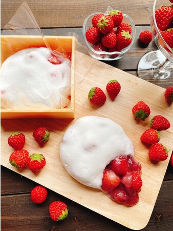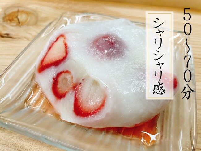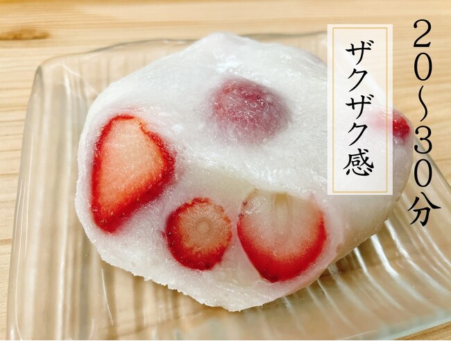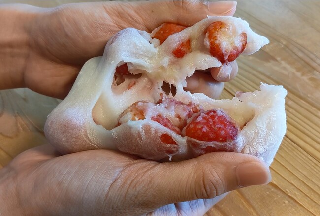 自家製ミルク餡と三河産イチゴをふんだんに使用し、求肥餅で包んだ「ごろごろ生いちごミルク爆弾大福」は、解凍時間を変えることによって食感がかわるので、色々な食べ方が楽しめる商品です。