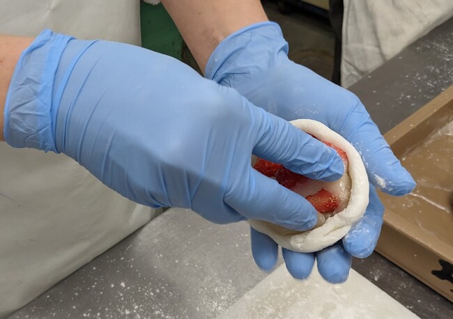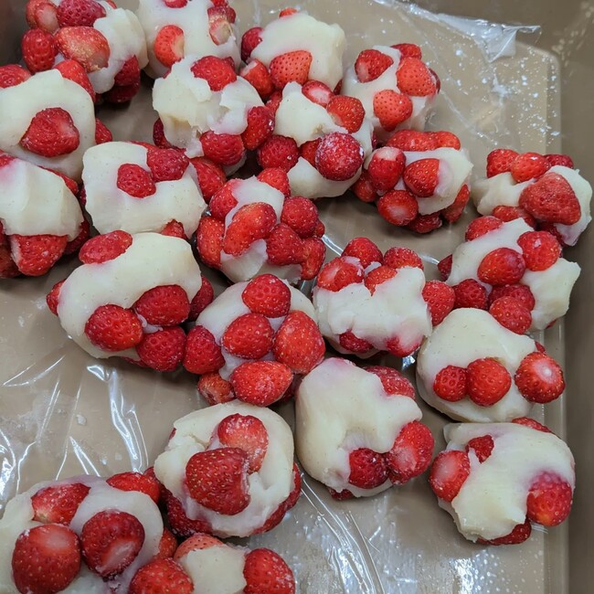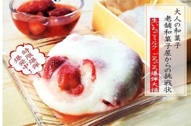 愛知県産の規格外の小さいイチゴを使用した「ごろごろ生いちごミルク爆弾大福」です。