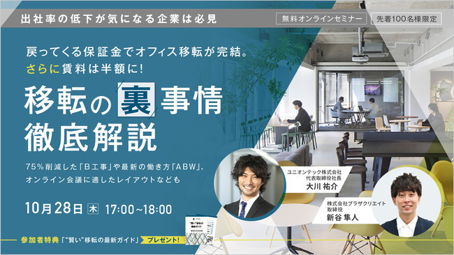 また、セミナーにご参加いただいた方限定で、7,000社の施工実績を持つユニオンテック社から「“賢い”移転の最新ガイド」をご提供。さらに、アンケートにお答えいただいた方限定で豪華無料特典をご用意しています。