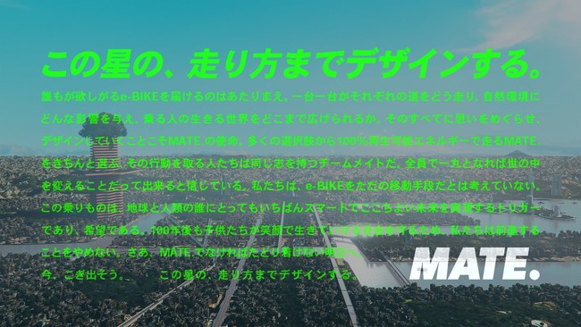 この度、デンマーク・コペンハーゲン発のe-BIKEブランド「MATE. BIKE (メイトバイク)」は、日本上陸1周年を迎え、e-BIKEのリーディングカンパニーとして社会貢献できるブランドを目指し、日本市場におけるコーポレートスローガン『この星の、走り方までデザインする。』を掲げ、ステートメントとともに発表いたします。