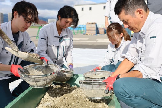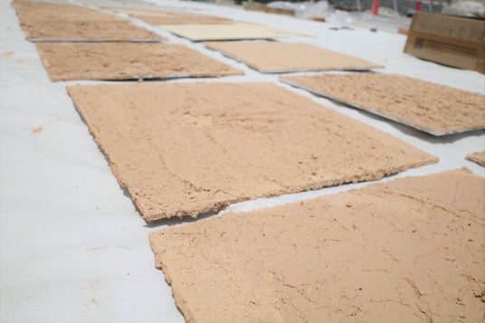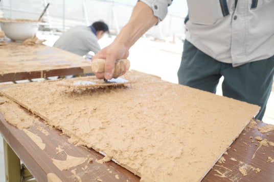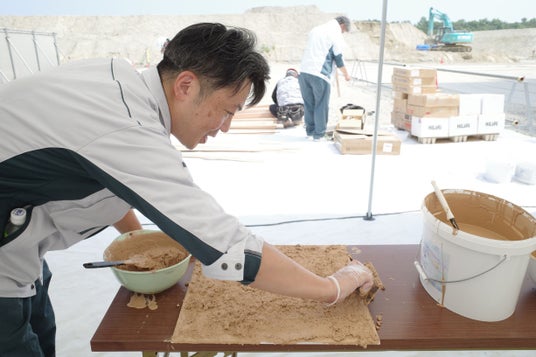 建設発生土を活用した「土壁パネル」工事現場では、地下躯体・基礎工事を施工するなどのために土を掘削しますが、その土は建設発生土としてダンプを使用して集積場へ運搬されます。運搬時には多くのCO2が排出され、環境に影響を及ぼす懸念があります。本取り組みでは、この建設発生土と、自然由来の素材・粘土からできたカラーペイント材を混合し、450mm角などのケイ酸カルシウム板に塗布した「土壁パネル」を作成しました。