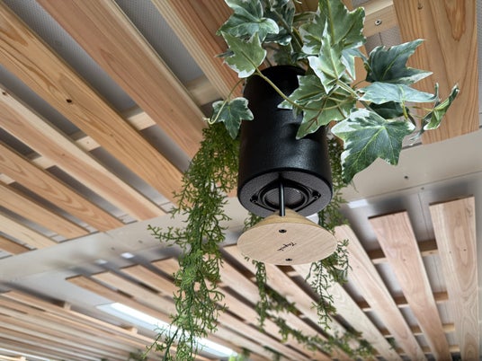 ハイレゾスピーカーによる自然音再生奈良県吉野地区の森林で採取した自然音を、ハイレゾ対応のスピーカーにて再生します。スピーカーは円錐の形をした反射板に音が反射し、360°に音が広がる無指向性で、スピーカーから音が出ているとは思えないほど、立体的で広がりのある音を奏でます。これに風の吹く音、水の流れる音、鳥や虫の鳴き声などの四季の自然音を流すことで、実際に森の中にいるような感覚で過ごすことができ、癒しや疲労回復の効果が期待できます。また、複数台のスピーカーを設置する場合は、同様な自然音の繰り返しとならないように、スピーカーごとに異なる尺の自然音をループ再生させ、それぞれの音源が自然な形で重なり合い、より自然に近い飽きがこない音環境を演出することができます。