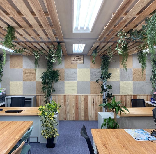 「吉野杉」などを活用した腰板・天井ルーバー・机天板*当社は奈良県が発祥の地であり、奈良県吉野山にて伐採される「吉野杉」を、内装・什器に活用しました。腰板、天井ルーバー、机天板*など、木材をふんだんに取り込むことで、木の香りが事務所内に漂い、リラックス効果も生まれます。端材を積極的に利用することで、限りある資源の有効活用にもなります。また、土壁パネル同様に乾式で取り付けができるため、容易な設置・撤去を実現し、転用・分別が可能です。人間の健康だけで