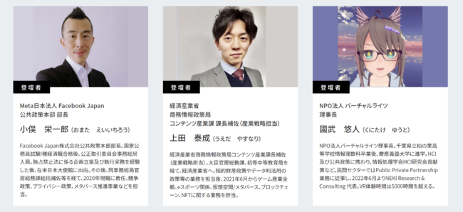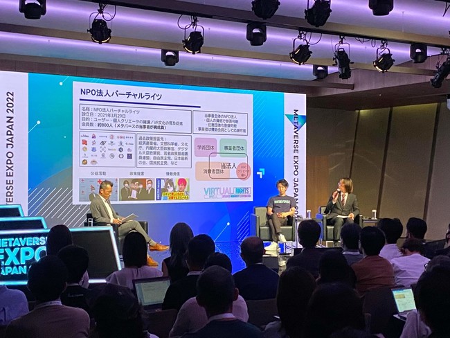 Meta日本法人Facebook Japanが主催する「METAVERSE EXPO JAPAN 2022」のパネルディスカッション「メタバースに求められる新しいルールの在り方」にMeta日本法人 Facebook Japan 公共政策本部長、経済産業省 商務情報政策局 コンテンツ産業課 課長補佐(産業戦略担当)、NPO法人バーチャルライツ 理事長の三者が登壇し、ルールメイキングについて議論を行いました。