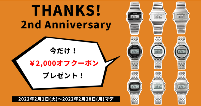 時計専門店として国内最大256店舗(リアル店舗250 オンラインストア6)を展開する株式会社ザ・クロックハウス(本社:東京都中央区、代表取締役社長:平野信之)は、プライベートウォッチブランドである『ザ・クロックハウス タウンカジュアル』が発売より2周年を迎えたのを記念し、2022年2月1日(火)からアニバーサリーキャンペーンを開催します。