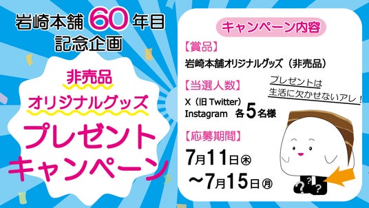 岩崎本舗では、本日7月11日(木)より岩崎本舗60年目を記念したプレゼントキャンペーンをX(旧Twitter)・Instagramにて開催中です。