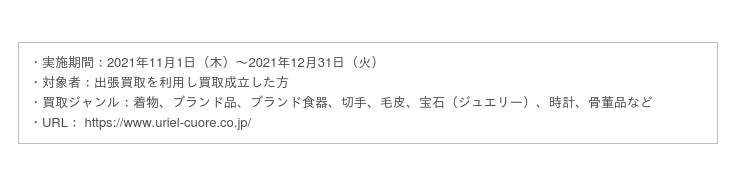 株式会社クオーレ(本社:愛知県大府市、代表取締役社長:竹本泰志、URL:https://cuore-group.com/ )が運営する買取専門店ウリエルでは、2021年末日まで買取価格が30%UPする「年末冬の大掃除応援キャンペーン」を実施します。