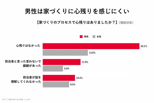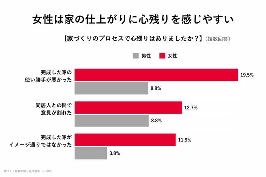 一方、女性は家の完成後に心残りを感じることが多く、特に「使い勝手」や「イメージの違い」に対する心残りが顕著です。完成した家の実際の使い勝手やデザインが当初の期待に沿わなかった場合、家そのものに対する心残りが生まれやすい傾向にあります。女性は家の快適性や機能性、デザインといった生活面を重視する傾向にあり、完成後に理想とのギャップを感じたときに強く後悔することがわかりました。