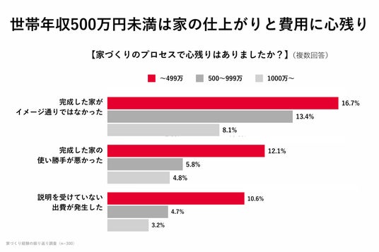 一方、世帯年収500万円以下の所得層では、「完成した家がイメージ通りではなかった」「完成した家の使い勝手が悪かった」「説明を受けていない出費が発生した」という回答が突出して高い傾向にありました。建築計画段階の打ち合わせを入念に行い、納得できる家づくりを心がける他、詳細な見積もりを必ずもらい、予算との照らし合わせを都度行うことが大切になっていきます。