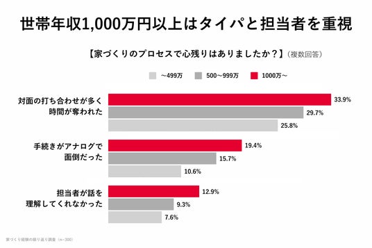 年収帯によって、抱いた心残りに差が生じることがわかりました。世帯年収1000万円以上の所得層は、対面での長時間の打ち合わせで時間が奪われたことに最も不満を感じており、次に、アナログな契約手続きを面倒に感じる、担当者が話を理解してくれなかったという回答に続きました。主に「時間的コスト」や「担当者の質」に対する回答が目立っているのが特徴です。