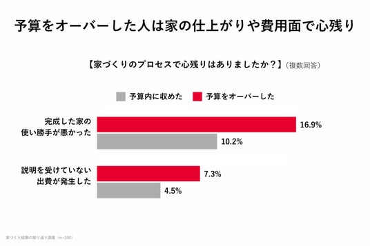 予算内に収めた人に比べて、予算オーバーだった人に特に多い心残りとしては、「完成後の使い勝手の悪さ」や「説明を受けていない出費の発生」が挙げられました。