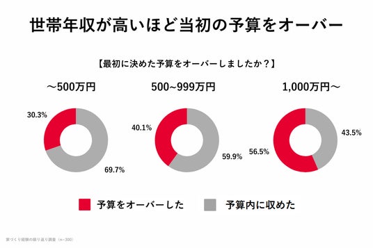 想定した予算に家づくりの費用が収まったかを質問したところ、全体で41.3%の人が予算オーバーを経験していました。さらには、世帯年収が高いほど、予算オーバーした人が多くなっています。世帯年収が高い人ほど、予算をオーバーしてでも理想の家を建てる傾向が見られます。