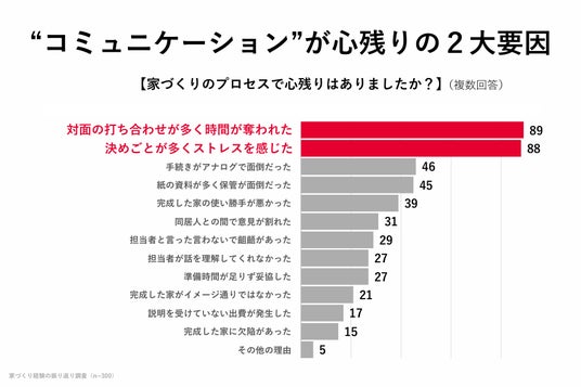 心残りを感じた点として、「対面の打ち合わせが多く時間が奪われた」「決め事が多くストレスを感じた」という選択肢に回答が集中しました。多くの人が、家づくりのコミュニケーションの手段や方法に不満を抱いています。また「手続きがアナログで面倒だった」と回答する人も多いことから、家づくりのステップに効率化が求められていると推測されます。その他、担当者とのコミュニケーションに不満を感じたケースも多く見られました。