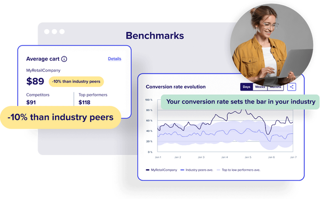 新たにリリースしたベンチマーク機能では、コンバージョン率、ロード時間、平均顧客単価、セッション当たりのページ閲覧数を分析することで、ブランド運営企業は自社のユーザー体験を同じ業界内の競合他社と比較することができます。競合他社のデータは最新のもので、匿名化されているため、ブランド企業は自社のパフォーマンスが優れているところと業界の水準に達していないところについて信頼できるインサイトを得ることができ、クラス最高のデジタル体験を目指すために何をすべきかを知ることができます。