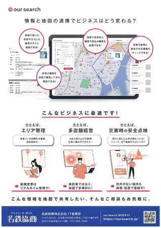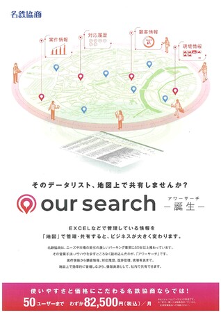 名鉄協商株式会社(本社:名古屋市中村区、代表取締役:小林 昌弘、以下当社という。)は、当社が「成長する企業のための手軽なDX」をコンセプトに展開するITソリューション「our seriesアワーシリーズ」の新たなラインナップとして、地物管理システム「our searchアワーサーチ」の販売を開始します。