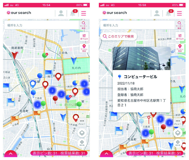 「our searchアワーサーチ」は、名鉄協商パーキングをはじめとするロケーションビジネスを行う当社が、実務で活用してきた物件管理地図システムをパッケージ化したものです。地図ソフト上で、案件情報から顧客情報、対応履歴、現場写真や契約書等のデータファイルまで、それぞれの地点に関連する情報をメンバー間でリアルタイムに登録・閲覧・管理できるクラウドサービスで、企業の営業活動はもちろん、災害など緊急時の被害状況の共有など、さまざまな用途で活用いただけます。