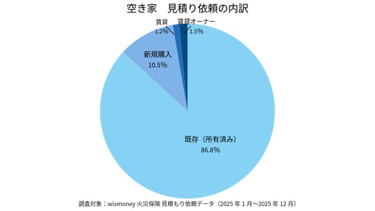 空き家における見積り依頼の内訳。既存(所有済み)物件が86.8%に達しており、新規購入よりも既存資産の維持・管理を目的とした保険検討が主流であることが分かります。