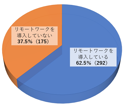 質問は3つで、1.現在のリモートワーク導入状況、2.1週間のリモートワーク日数(週に何回オフィスへ出社しているか)、3.最近のリモートワークに対する傾向についてヒアリングを行いました。