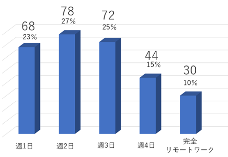「リモートワークの導入している」は62.5%となり、オフィスに出社をしない「完全リモートワーク」の割合は全体の6.4%となった。リモートワークを導入していると答えた292名のうち、90%の会社はリモートワークとオフィスワークを併用する「ハイブリッドワーク」の形態をとっており、週2日のリモートワークが最も多く27%、次いで週3日のリモートワークが25%という結果となりました。