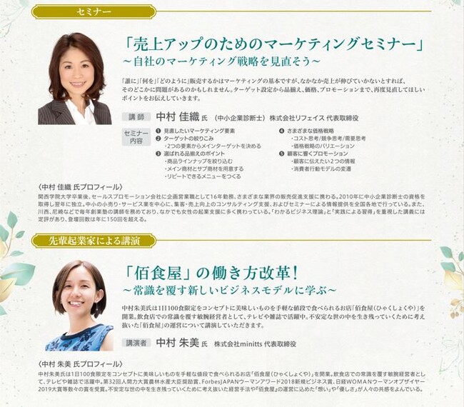 本セミナーでは、「経営に関する知識の不足」などの悩みを解決するため、専門家や先輩起業家を招き、女性起業家の皆さまに有益な情報を提供しました。