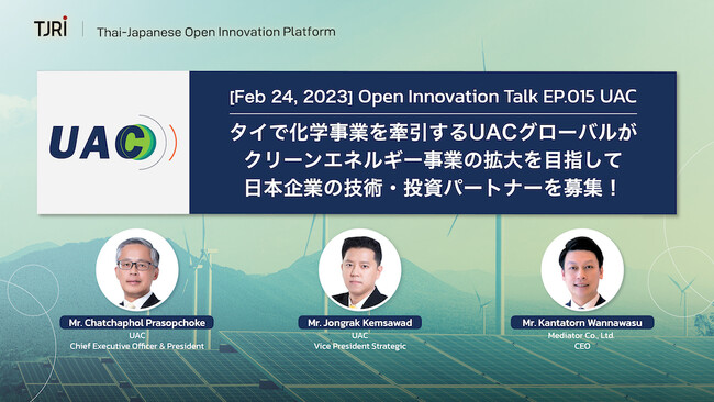 日本とタイをビジネスでつなぐB2Bマッチングプラットフォーム「TJRI」を運営するMediator Co., Ltd.(本社:タイ王国バンコク、代表取締役社長:ガンタトーン・ワンナワス)は、タイの化学事業を牽引するUACグローバル社をゲストに迎え、2月24日(金)日本時間16:00よりハイブリッド形式(オンライン/オフライン)にて「Open Innovation Talk」を開催します。本プログラムでは、タイにおけるエネルギー事業の背景やトレンドを踏まえ同社が募集するパートナー企業の詳細について発表します。タイや東南アジアへのビジネス進出を目指す企業は絶好の機会となります。ぜひご参加ください。