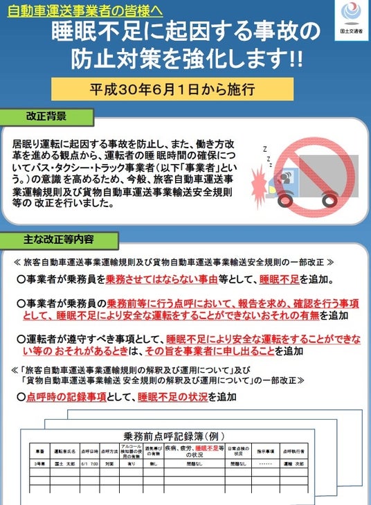 自動車運送事業者については平成30年6月1日から睡眠不足に起因する事故の防止対策が強化され、事業者はドライバーの睡眠不足の確認、及び、その記録の保存が義務付けられました。