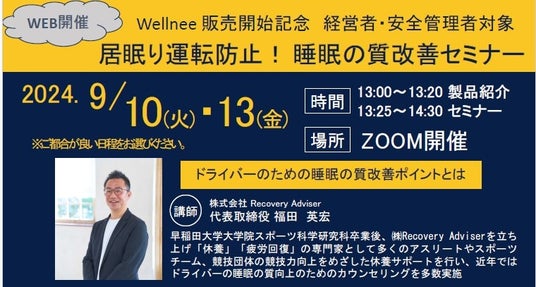 このセミナーでは、4月から販売を開始した「お腹にベルト(ゴム)を巻いて寝るだけで睡眠の質が可視化できるWellnee」の製品紹介、そして、可視化した結果の活用方法、及び、睡眠の質を高めるヒントをお伝えするために、プロスポーツリーグの選手などの睡眠コンサルタントをされているプロの睡眠コンサルタントをお呼びして、質の高い睡眠を取り、居眠り運転防止対策に役立つセミナーを開催することになりました。