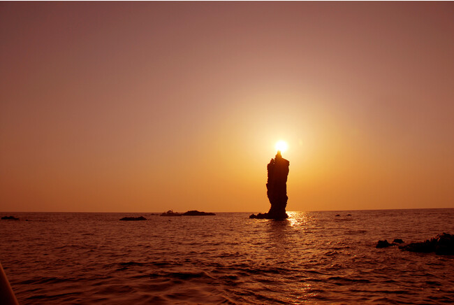 島後の北西の沖合いに海から約20メートルの高さでそびえ立つ奇岩ローソク島。島の先端に夕陽が重なるその瞬間、まるで一本の巨大ローソクに火を灯したように輝きます。自然が作り出した綺麗な風景は、季節や天候によっても毎回違い、感動的な景色です。