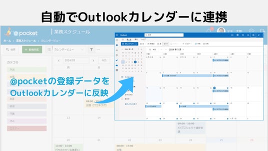 <Outlookカレンダー連携>@pocketのデータをOutlookカレンダーに連携出来ます。@pocketにアカウントを持たない取引先の方とのスケジュール共有等に活用可能です。
