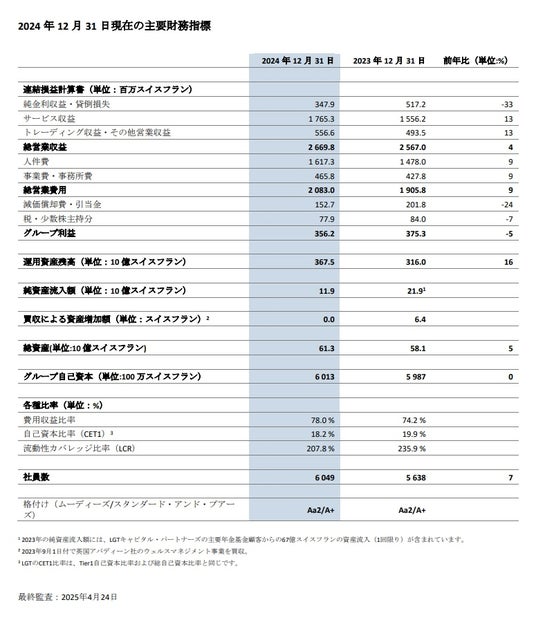 LGTは2025年の見通しについて自信を持っており、今後も安定したビジネスモデルを基盤に広範囲にわたるウェルスマネジメントおよびアセットマネジメント商品の提供を通じて、お客様の価値創造に注力してまいります。その一環として、LGTは投資に関する専門性の継続的な強化に努めています。これには、LGTが独自に開発した一連のサステナブル投資商品やプライベート市場投資へのアクセスなどの専門分野も含まれており、LGTのプライベートバンキングのお客様とLGTキャピタル・パートナーズの機関投資家のお客様から引き続き高い関心を集めています。