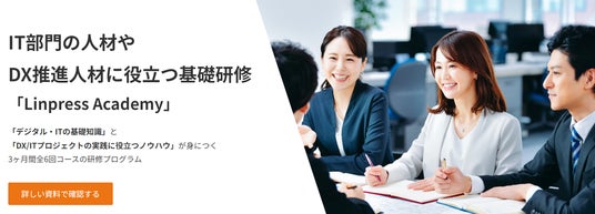 株式会社リンプレス(本社:東京都港区、代表取締役社長:三宮壮、以下「リンプレス」)は、IT部門やDX専門部署への異動者および各事業部門におけるDX推進担当者を対象に、デジタル・ITの基礎知識やプロジェクト実践に役立つスキルが網羅的に学べる研修「Linpress Academy」を2024年5月から開催いたします。