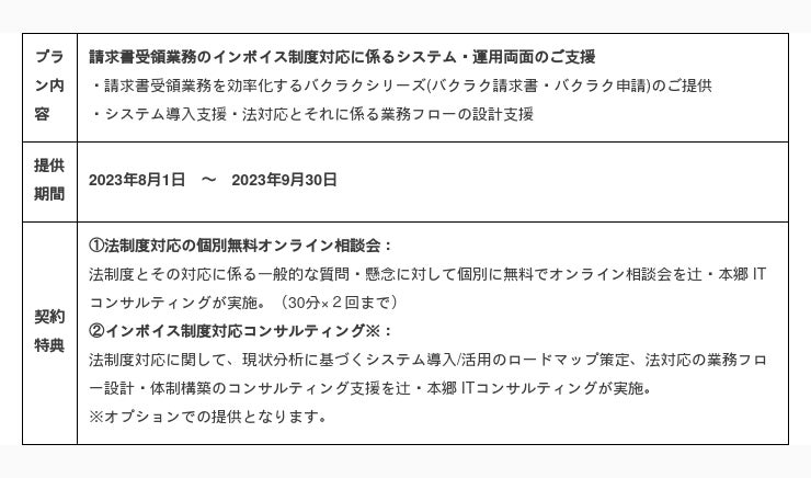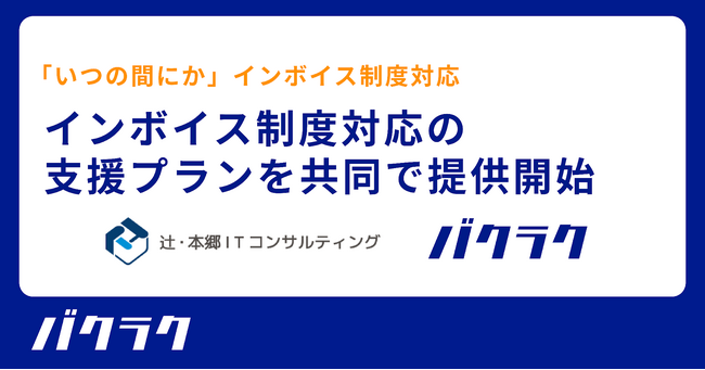株式会社LayerX(本社:東京都中央区、代表取締役CEO 福島良典)と辻・本郷ITコンサルティング株式会社(本社:東京都新宿区、代表取締役社長:黒仁田 健)は共同で、株式会社LayerXの扱う法人支出管理サービス「バクラク」において、2023年10月1日に開始する適格請求書等保存方式(以下「インボイス制度」)への対応を支援するプランを提供開始しました。