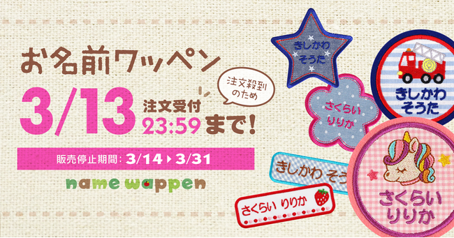 入園・入学準備にとお買い求めいただいているお名前ワッペンが、ご注文の集中で製造が追いつかなくなり、お届けまでにお時間がかかる状況となってまいりました。そのため、受注受付を一時的に締め切らせていただきます。