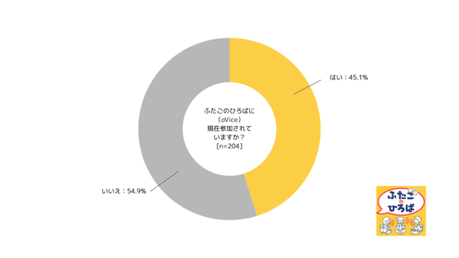 当法人が実施する『ふたごのへや(LINEオープンチャット)』と『ふたごのひろば(oVice)』2つのサービスへの利用状況としては、「ふたごのへや:54.4%」「ふたごのひろば:45.1%」となり、約半数の方がオンラインコミュニティに参加し、多胎育児にかかわるテーマで全国各地の多胎ママパパとコミュニケーションを取っていることがうかがえる。