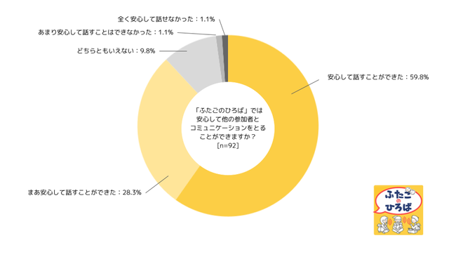 『ふたごのひろば』に満足している方は85.9%となっており、顔が見えない相手と音声だけのコミュニケーション空間に好意的であることがうかがえる。さらに「安心してコミュニケーションがとれた」と回答した方も88.0%となり、オンライン上での会話のやりとりもスムーズにできていると考えられる。
