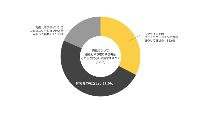 オンライン・対面どちらのほうが安心して話せるかについては、いずれについても一長一短があることから「どちらでもない」と回答する方が大半であった。そのことから、多胎家庭の交流する場所としては、オンラインだけではなく対面での交流機会をつくることも重要と考えられる。
