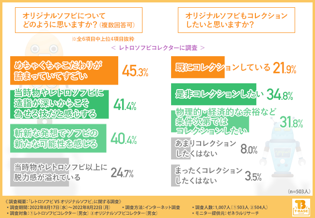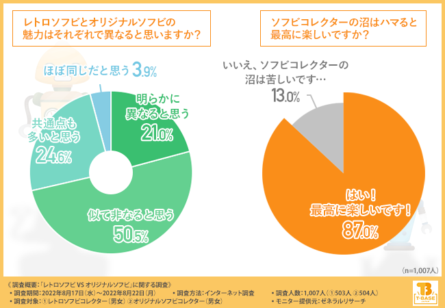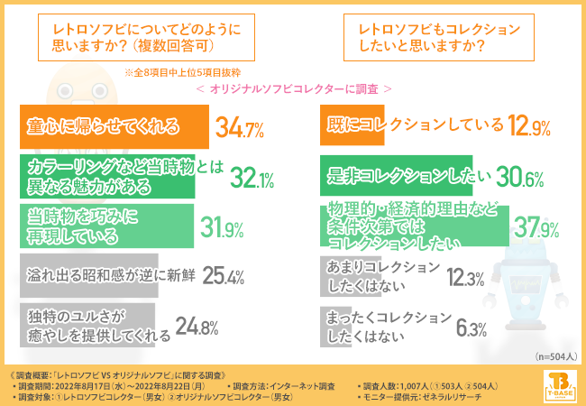 『T-BASE JAPAN』を運営するトイズキング(本社所在地:名古屋市中村区、代表者:山本 祐介)は、1.レトロソフビコレクター(男女) 2.オリジナルソフビコレクター(男女)を対象に、「レトロソフビ VS オリジナルソフビ」に関する調査を実施しました。