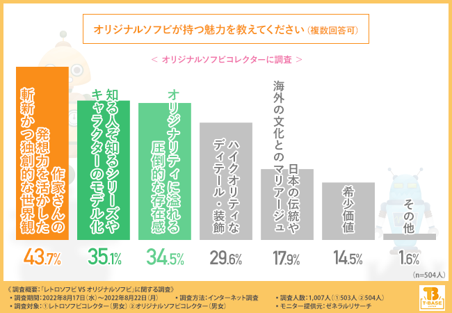 オリジナルソフビの魅力は『作家さんの発想力を活かした斬新かつ独創的な世界観』が4割を超え最多