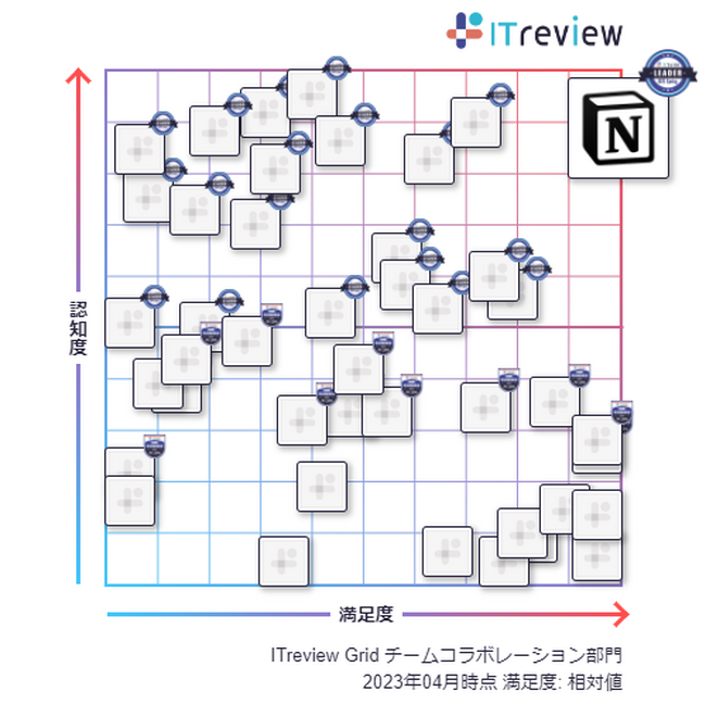 コラボレーションソフトウェア「Notion」を提供するNotion Labs Japan合同会社 (本社:東京都、ゼネラルマネージャー:西 勝清)は、アイティクラウド株式会社(本社:東京都港区、代表取締役社長 兼 CEO:黒野 源太)が運営するB2B向け IT製品/SaaSのレビュープラットフォーム「ITreview」が4月19日に発表したアワード「ITreview Grid Award 2023 Spring」において、「チームコラボレーション」「プロジェクト管理」「タスク管理」「業務可視化ツール」「AIライティングツール」の5部門で「Leader」に選出されました。 Notionがエントリーする全部門での選出であり、チームコラボレーション部門では12期連続の選出となります。また、4月26日に発表された「ITreviewカテゴリーレポート」では「チームコラボレーション」「プロジェクト管理」「タスク管理」「業務可視化ツール」の4部門で「顧客満足度No.1」を獲得しました。
