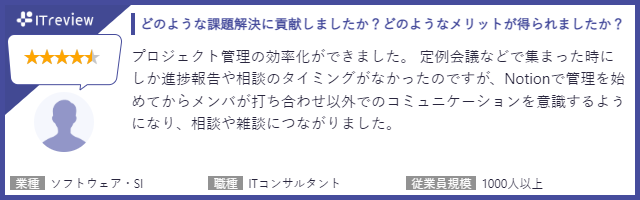 レビュアーの皆様からは導入による様々な効果を感じていただいており、特に「チームでのプロジェクト推進が効率化された」など業務やプロジェクト管理の効率化を実感されたというコメントを多くいただきました。また、Notion AIについても「AIに翻訳やブレストを頼むことで、業務効率化につながった」など、更なる業務効率化に寄与したとして高く評価いただきました。