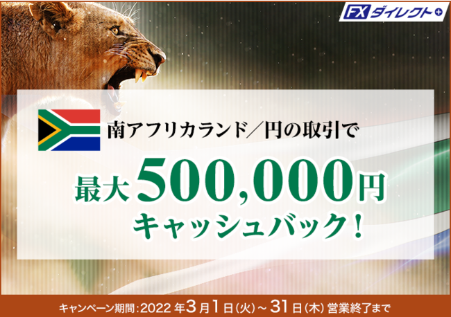 セントラル短資FX株式会社(本社:東京都中央区、代表取締役社長:松田 邦夫)は、2022年3月31日まで南アフリカランド/円の取引を対象としたキャッシュバックキャンペーンを実施します。