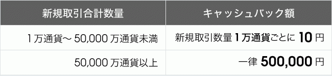 新規取引合計数量が10,000万通貨 ⇒ 100,000円キャッシュバック