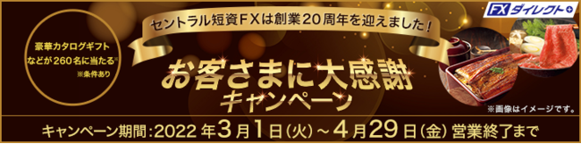 金融の街、東京・日本橋に本社を置くセントラル短資FXは、3月に創業20周年を迎えました。ご愛顧くださったお客さまにも、これを機にお取引くださるお客さまにも、心からの感謝の気持ちを込めて、豪華ギフトなどが抽選で260名様に当たる大感謝キャンペーンを4月29日まで実施しています。