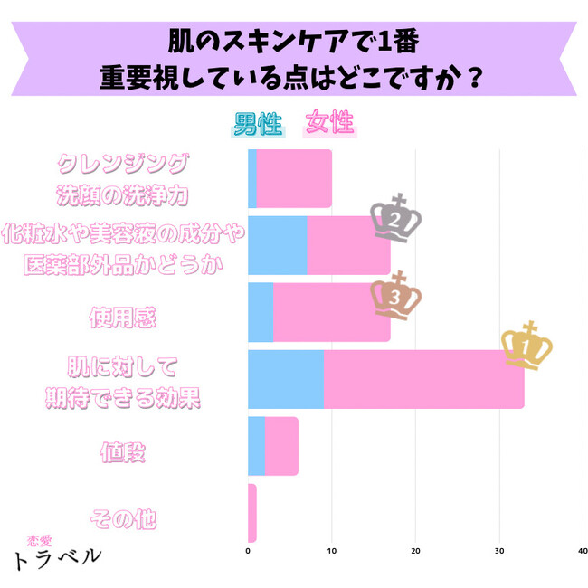 中でも『肌に対して期待できる効果』を重要視しているかたが、男女ともに多くいることがわかりました。