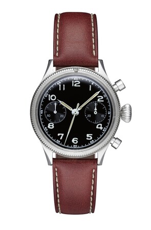 この時計は、1955年から1959年にフランス空軍に納められた1100本のモデルから想を得ています。その名称には、ローマ数で「タイプ XX」と表記される海軍航空隊モデルを含むあらゆるモデルと違い、アラビア数字の「20」が用いられています。ダイヤルは、原型となる「タイプ 20」のスタイルを忠実に保ちながら、ブラックで現代的に仕上げられています。アラビア数字とベゼルの3角マーカー、そしてすべて針にミントグリーンの夜光塗料が施されています。3時位置の30分積算計は、9時位置のスモールセコンドより若干大きくなり、4時と5時の間に日付表示の窓が設けられています。ステンレススティールによる直径42mmのケースには、過去に空軍向けに供給されたモデルと同様に、目盛りの刻みがなく縁に縦溝模様を施したベゼルが備わります。リュウズはオリジナルモデルを想起させるポワル型(梨型)で、3つのポジション(1 ニュートラル、2 日付修正、3 時刻合わせ)の各調整が行えます。2時位置のプッシャーはクロノグラフの作動に用い、計測のスタートとストップを行います。また4時位置のプッシャーは、クロノグラフ針と積算計のゼロリセットに用い、有名なフライバックの原理によって瞬時にクロノグラフの再スタートが可能になります。