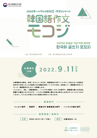 大阪韓国文化院は、韓国の祝日「ハングルの日」を記念して、韓国語の作文コンクール「韓国語作文モコジ」を開催する。最優秀賞には賞状・副賞として5万円相当のギフト券を贈呈。作品の応募締切は2022年9月11日(日)必着。