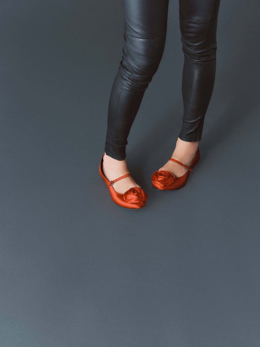 大胆なコサージュが目を惹く「ローズモチーフ・バレエシューズ」。上品な光沢感のあるサテン素材を全面に使用したメリージェーンタイプで、どこかレトロモダンな印象を与えます。カラーは、鮮やかさと深みを両立させたレッドと、クールでモードな雰囲気漂うブラックの2色展開で、丸みを帯びたシルエットにストラップが効いた1足は、女性らしさ溢れるデザインに仕上がっています。